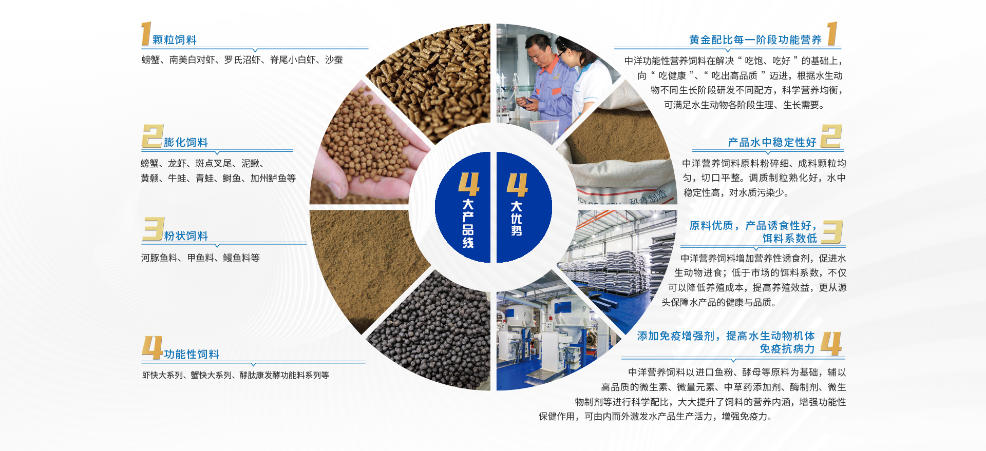 中洋動物營養飼料,是中洋人在養殖實踐中對飼料提出更高要求,從“吃飽、吃好”向“吃健康、吃出高品質的口感及營養功能”轉變,用全新的思維和理念、現代化的技術與手段深入解決水產養殖業苗種退化、疾病頻發、產品藥殘、 養殖難度增大等問題而建設的又一重要產業項目,是中洋漁業食品全產業鏈上的重要環節。