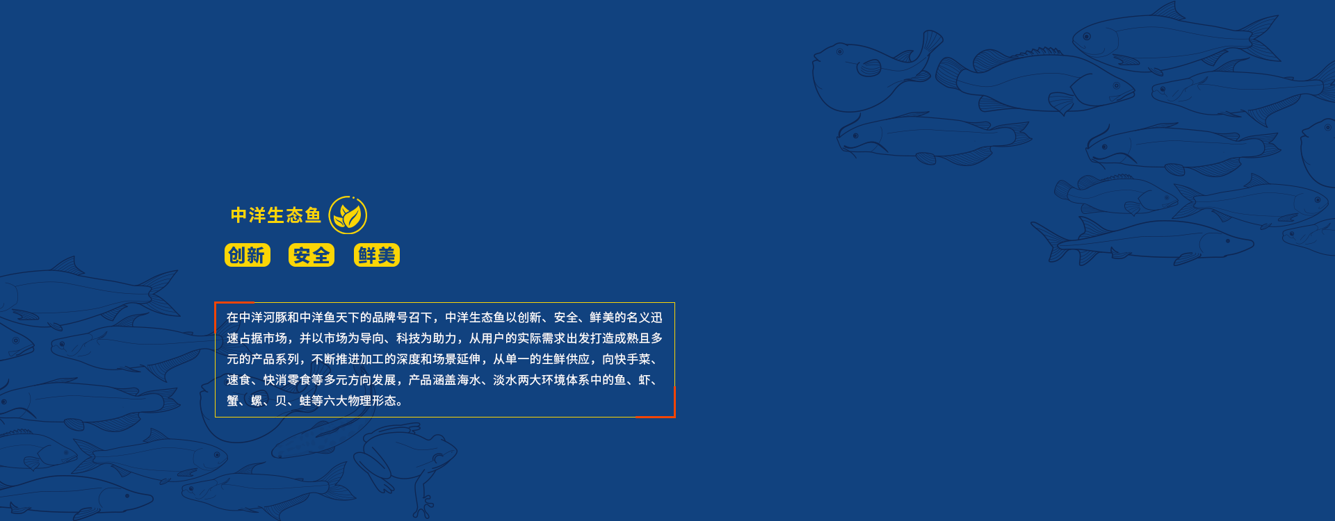 形成了以中洋河豚為代表的珍稀魚系列,以中洋南美白對(duì)蝦和小龍蝦為代表的蝦系列,以中洋大閘蟹為代表的蟹系列,以中洋生態(tài)牛蛙為代表的蛙系列,以加州鱸魚、美國(guó)鮰魚、中國(guó)黑魚為代表的特色魚系列,海捕魚系列,魚圓系列,清水魚片系列,原切貝螺片系列,快手菜和快銷零食等十八大產(chǎn)品系列。